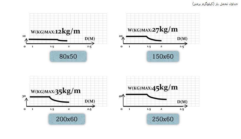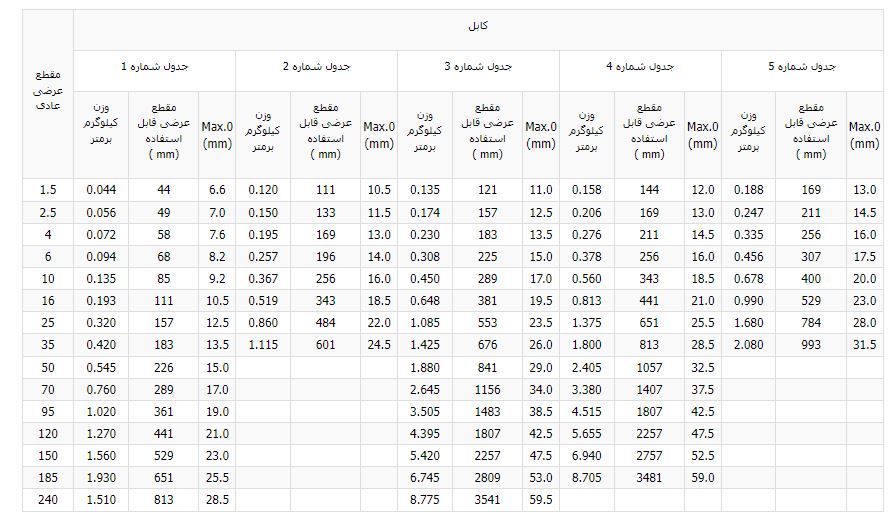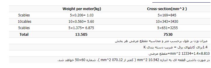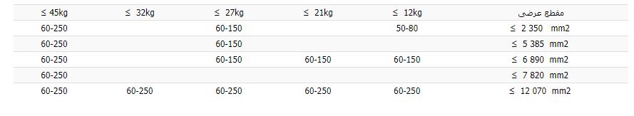 جدول مقطع عرضی (شامل ابعاد لوازم)